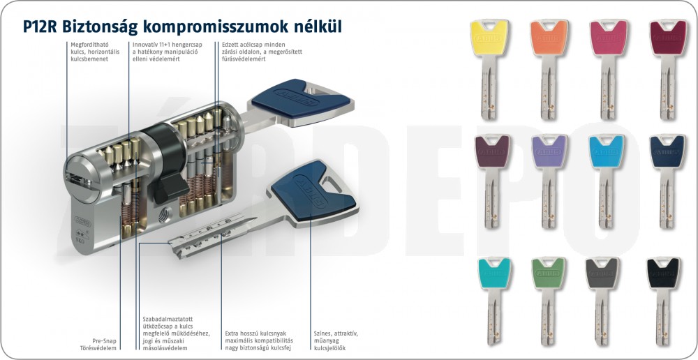 - 12 csapos működés szabadalmaztatott „Stop pin” ütközőcsappal, jogi és technikai védelemmel, amely magas szinten véd a menipulációs nyitási technika (más néven zárfésülés) ellen