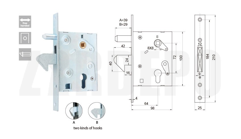 Speciálisan nehéz tolókapkhoz tervezett europrofilú hengerzárbetéttel működtethető kampós tolókapuzár. Jobbos és balos ajtóba egyaránt beszerelhető.