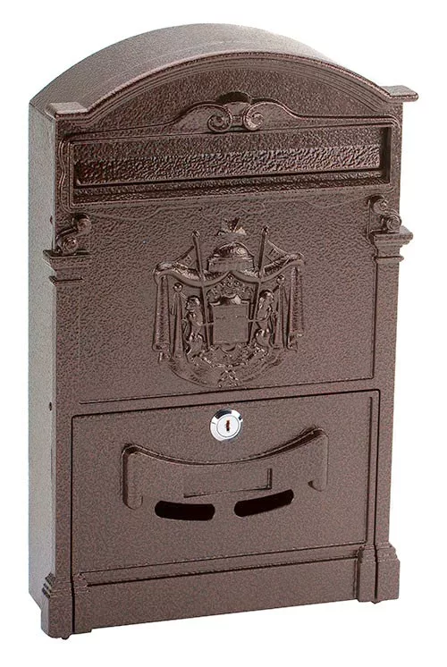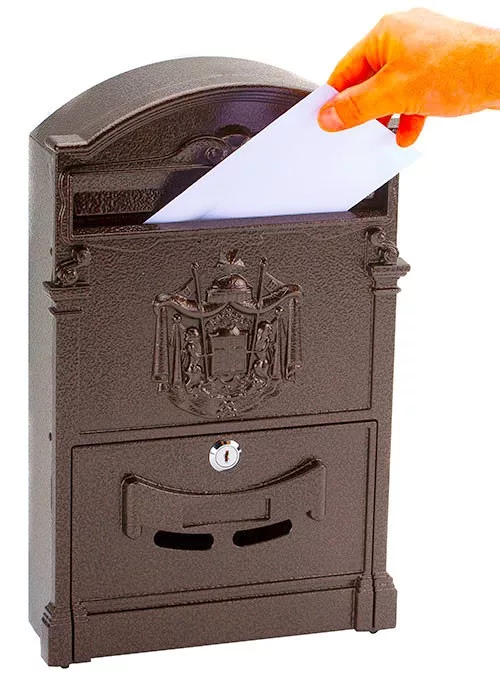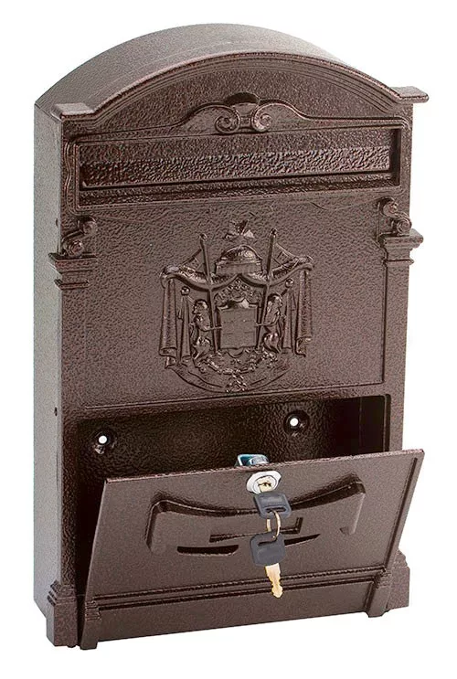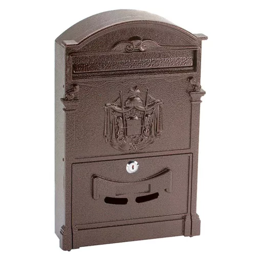 Nagyméretű utcai horganyzott acél postaláda aluminium öntvény előlappal, felső bedobónyílással, fentről lefelé nyíló zárható ajtóval, 2 db gyári kulccsal. Házfalra, vagy kerítésre egyaránt felszerelhető.