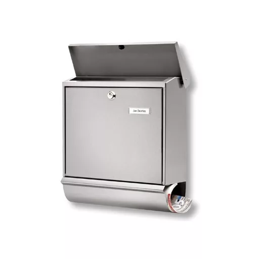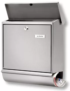 Extra méretű, modern vonalvezetésű, nemesacélból készült, postaláda, újságtartóval, műanyag névtábla tartóval, nikkelezett 5 csapos minőségi zárszerkezettel, felső, felhajtható bedobónyílással, nyitáshatárolóval ellátott lefelé nyíló ajtóval. A felszereléshez szükséges csavarokkal és 2 db gyári kulccsal szállítjuk.