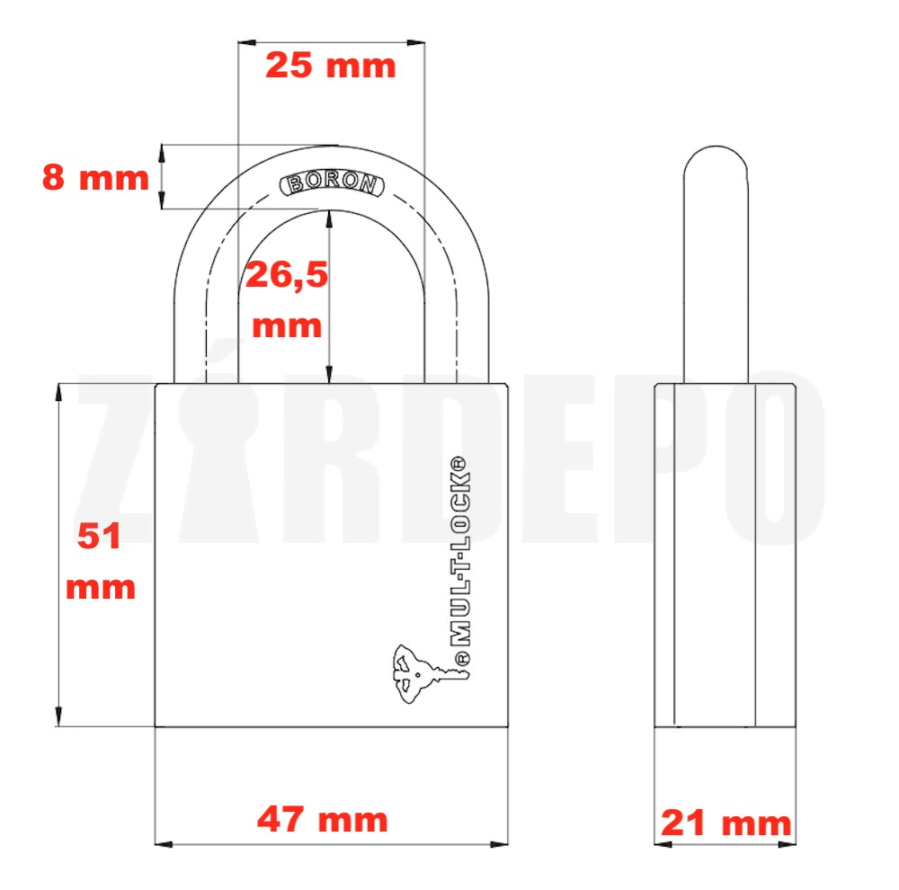 Mul-T-Lock® G-47-es biztonsági lakat edzett bóracél kengyellel, 7x7® fúrt kulcsos rendszerű zárszerkezettel, fúrás és magkihúzás elleni védelemmel és 5 db gyári kulccsal.