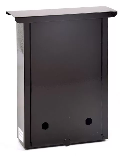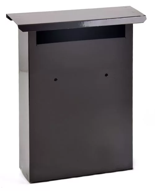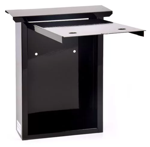 Kerítésen belülre felszerelhető szinterezett kezeletlen acélból készült postaláda betekintő nyílással és felfelé nyíló ajtóval.