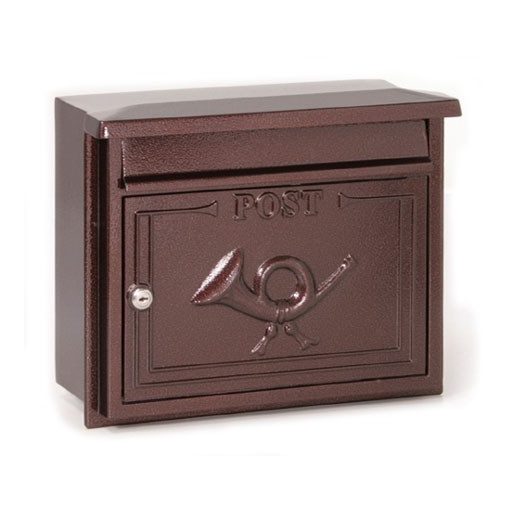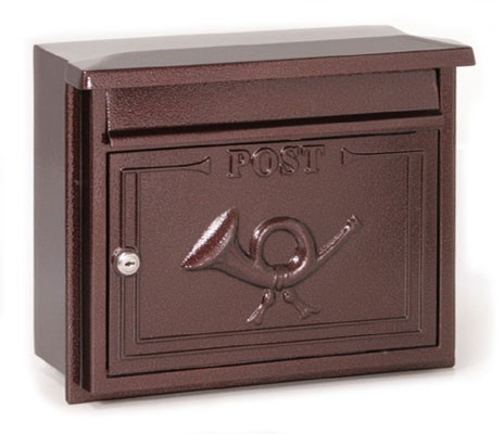 Kerítésbe építhető alumínium öntvény postaláda postakürtös emblémával, első bedobónyílással, oldalra nyíló ajtóval, minőségi krómozott cilinderzárral.